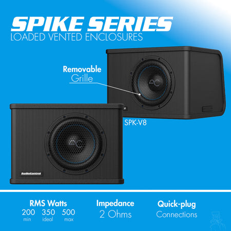 - Spike Series Subwoofer: The specifically engineered AudioControl 8", 10", or 12" loaded subwoofer delivers exceptional clarity and deep, powerful low frequencies for maximum bass output, even in compact spaces.