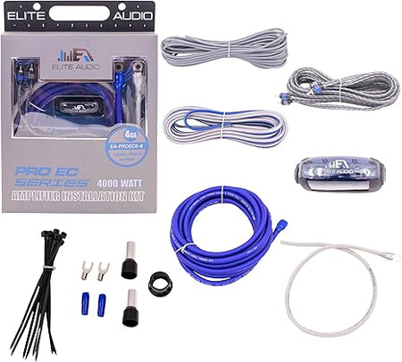 Upgrade your car audio with the Elite Audio 4-Gauge Amplifier Wiring Kit. Handles up to 4000W max power and includes power cable, RCA cable, Mini-ANL fuse holder, speaker wire, and all installation accessories for a clean, professional setup.